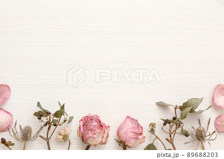 バラのドライフラワーのデコレーションと木目の背景とコピースペース