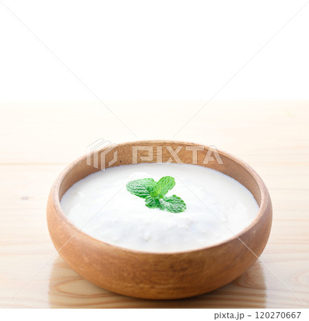 木の器に盛り付けたヨーグルト ( プレーンヨーグルト )