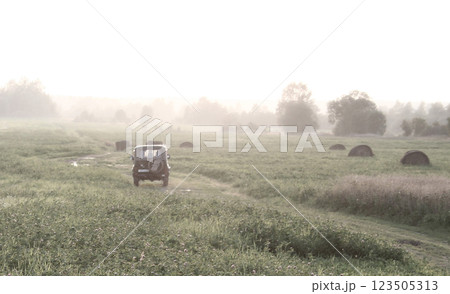 Haymaking process: a baling machine collects dried grass and creates dense, round hay bales tied with twine. This efficient farming method simplifies storage and transportation of animal fodder.