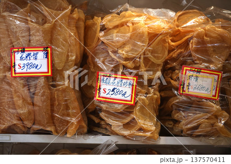 香港・徳輔道西の乾物店で売られる魚の浮袋。とても高価で「魚胆}と呼ばれる高価な中華食材