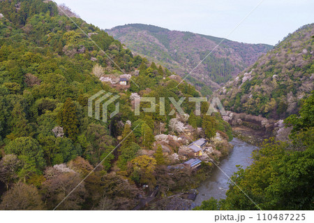 亀山公園展望台から臨む保津川と大悲閣千光寺の春の風景