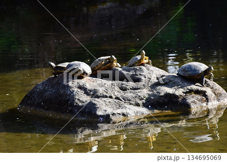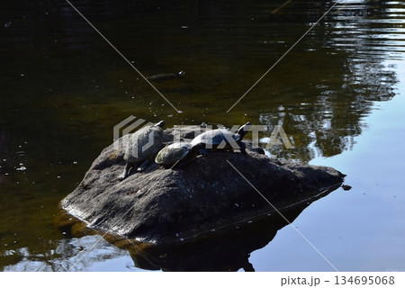 神奈川県 平塚市総合公園の日本庭園池と甲羅干しの亀