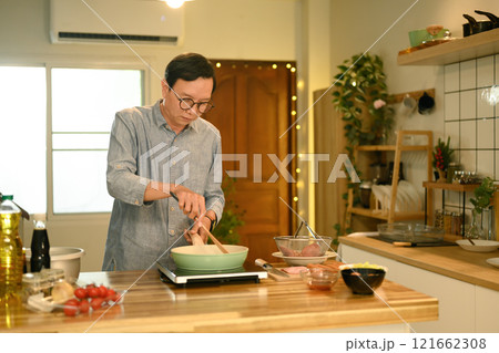 Middle aged man preparing a delicious meal with fresh ingredients in a kitchen