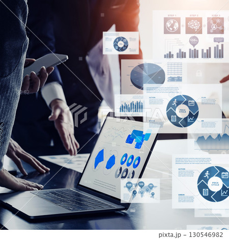 会議するビジネスパーソンのグループとビジネスデータ バナー・広告向け正方形ビジュアル