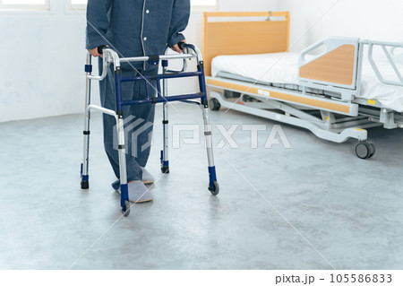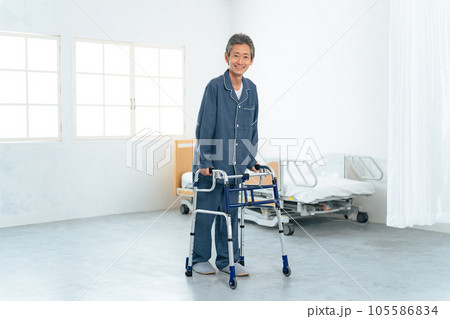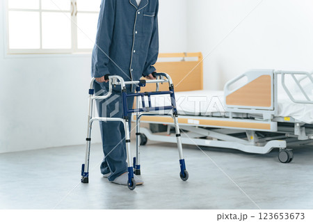 歩行器を使ってリハビリする男性の全身写真