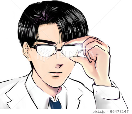 怪しみ目を光らせ何かを見つめる白衣姿の黒髪メガネドクターのカラー漫画イラスト