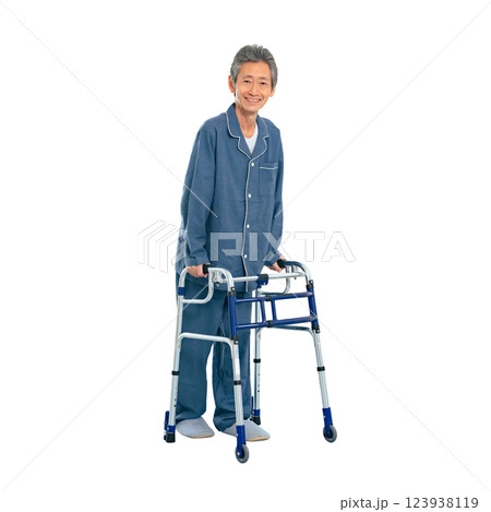 歩行器を使ってリハビリする男性 手作業で精密に切り抜いた背景透過全身写真PNG