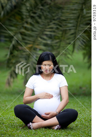 Expectant mother meditating in the garden.