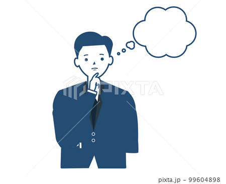 吹き出しを浮かべ想像をするビジネスマン。良いアイデアを考えるスーツ姿の男性