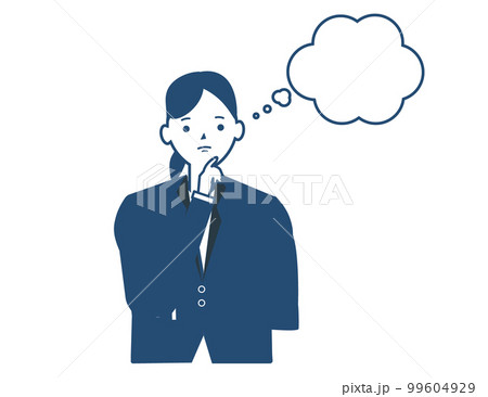 吹き出しを浮かべ想像をするビジネスウーマン。良いアイデアを考えるスーツ姿の女性