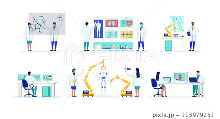 Scientists presenting molecular structures, researchers analyzing medical data, laboratory work. Engineers operating robotics artificial intelligence modern technology setting. Medical professionals