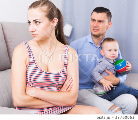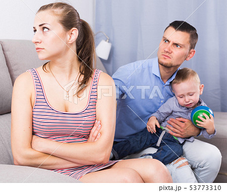 gloomy man and woman with crying son quarreled