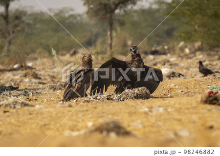 Two Cinereous vulture or black vulture or monk vulture or aegypius monachus fight or in action with full wingspan aggression at desert national park jaisalmer rajasthan india asia