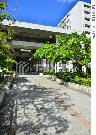 東京外国語大学 北西入口付近の事務局・本部管理棟 夏の青空 東京都府中市