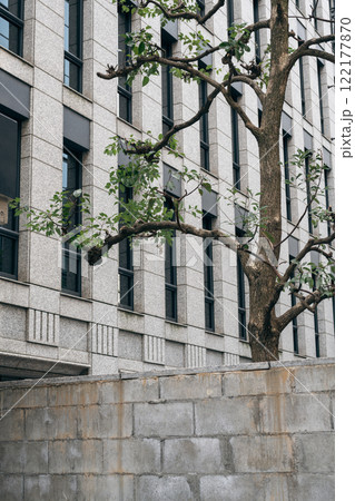 Gray modern building and wall with green tree