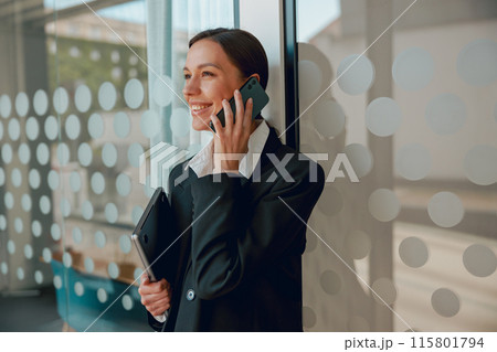 Businesswoman is on a phone call while holding a tablet in a contemporary office setting