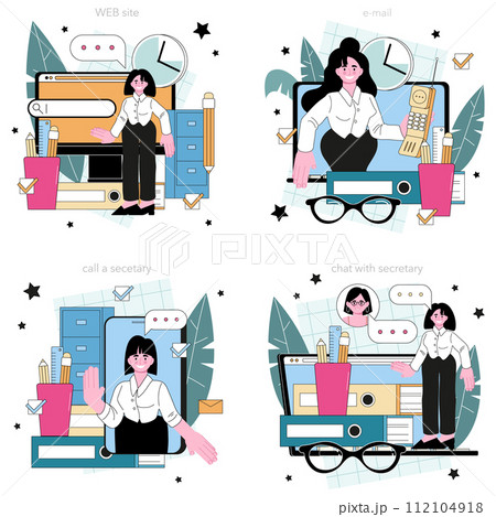 Secretary online service or platform set. Receptionist answering calls, planning the day and records keeping. Online call, chat, e-mail, website. Flat vector illustration