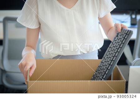 段ボールに荷物をまとめる女性の写真素材