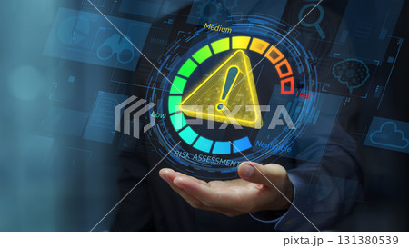 リスクマネジメントとリスク評価のグラフ。分析とモニタリングプロセスのシステム。黄色い三角形の警告アイ