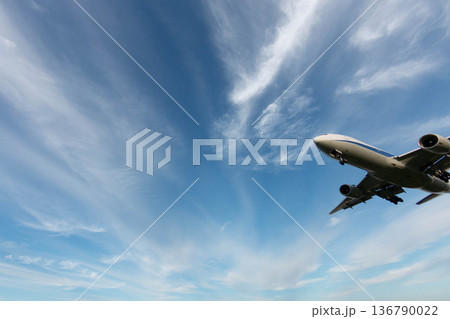雲が広がる青空を飛ぶ旅客機