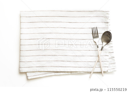 スプーンとフォークを乗せた白地ストライプのリネン