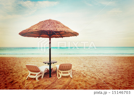 Tropical beach view. Two beach chairs.