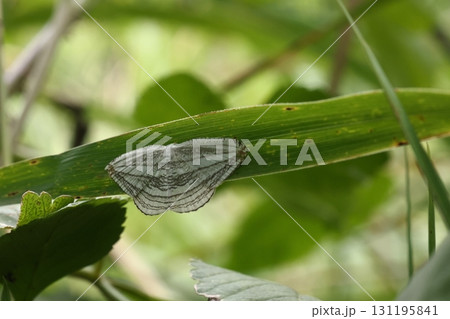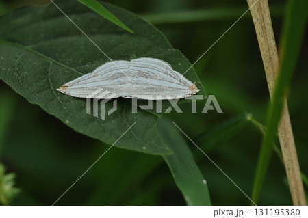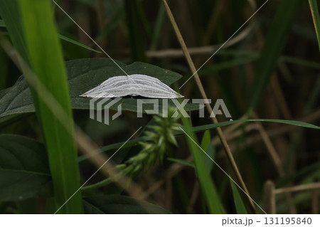 生き物 昆虫 ギンツバメ、開張三センチ弱の小さなガ。白地に灰色の複雑な線模様、翅先が薄オレンジ