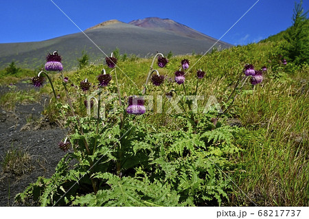 富士山二ツ塚ハイキングコースに咲くフジアザミの花に宝永山と山頂