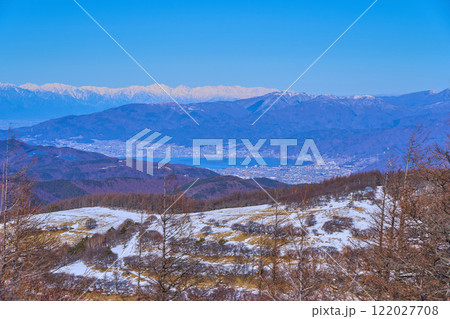 冬の長野県富士見町の入笠山から北西側の諏訪湖,北アルプス,諏訪市などの眺望
