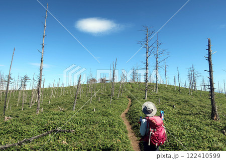長野の二ツ山付近の縞枯れの林で佇む女性登山者