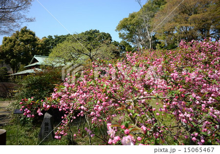 カイドウが満開の皇居の二ノ丸庭園の諏訪の茶屋
