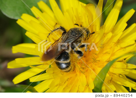 タンポポを吸密する二ホンミツバチ