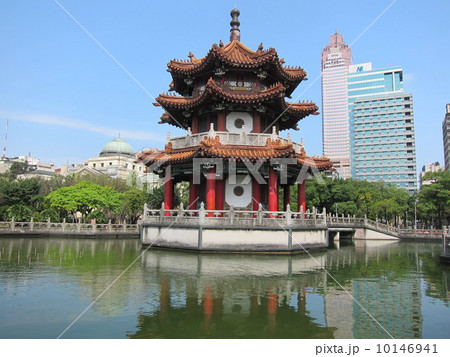 Traditional Chinese style pagoda and pavilion at 228 Peace Memorial Park in Taipei City.