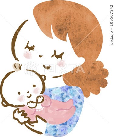 目を閉じて優しく赤ちゃんを抱っこする母親の手描きイラスト