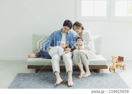 マイホームのリビングソファーで赤ちゃんと過ごす若いファミリー,家族,妊婦