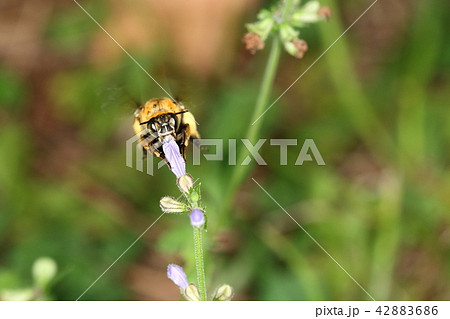 生き物 昆虫 スジボソフトハナバチ、アキノタムラソウで食事。比較的ゆったりと飛ぶタイプのようです