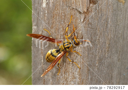 生き物 昆虫 キアシナガバチ、五月。木の表面を削って巣材を調達中。多分、女王蜂かと