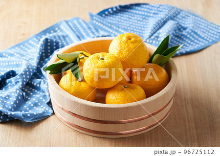 桶に盛った柚子