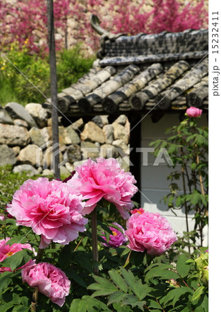 鮮やかなピンク色の牡丹の花。牡丹は花の富貴なるものなり