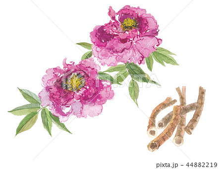 水彩で描いた牡丹の花と根 牡丹皮 ボタンピ