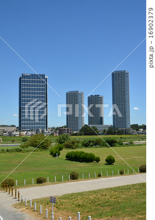 公園の風景 再開発された二子玉川公園から望む武蔵小杉の高層ビル群 東京都世田谷区