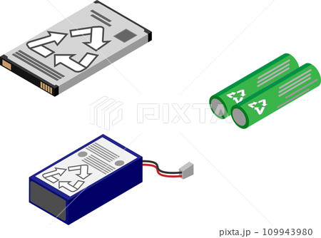 アイソメトリックなリサイクルマークが付いた電池のイラストセット