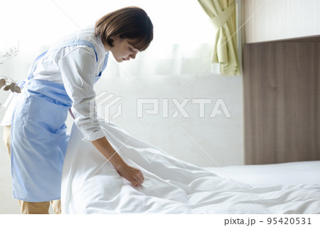 ベッドメイクをする可愛い女性