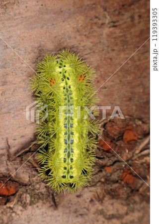 生き物 昆虫 ヒロヘリアオイラガ、終齢幼です。軟らかそうな体の下から頭が見えています