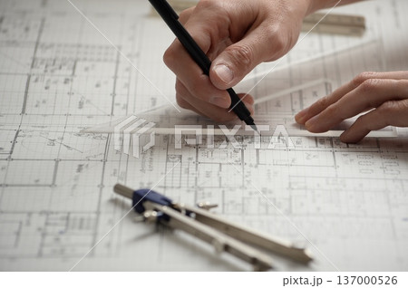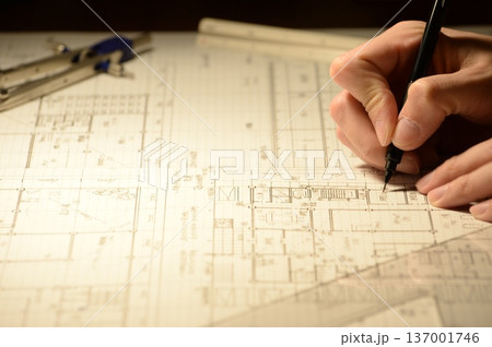 夜に建築図面を製図する日本人建築士の手元