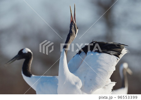 青空の下で鳴きかわすタンチョウ(北海道・鶴居)