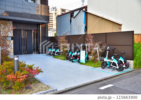 ビルの下の電動キックボードのシェアリングステーション