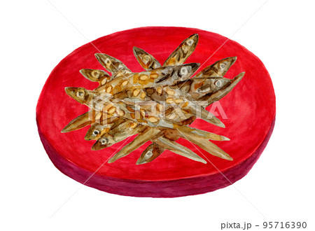 家庭的で素朴な自家製の「ナッツ添えの田作り」水彩画風