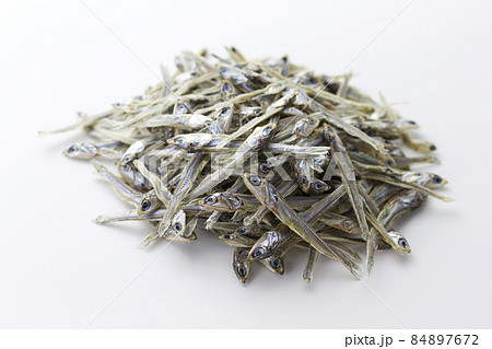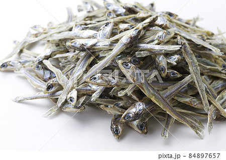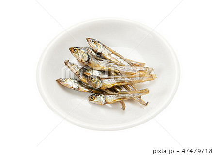 小皿に盛られた片口いわしの煮干しを白背景で撮影