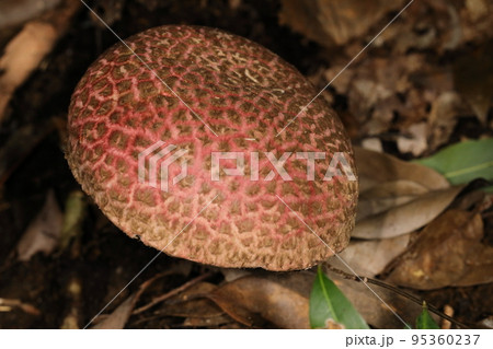 自然 茸 キクバナイグチ、傘の表面は赤く細かいひび割れ状。裏側は襞ではなく黄色の管孔